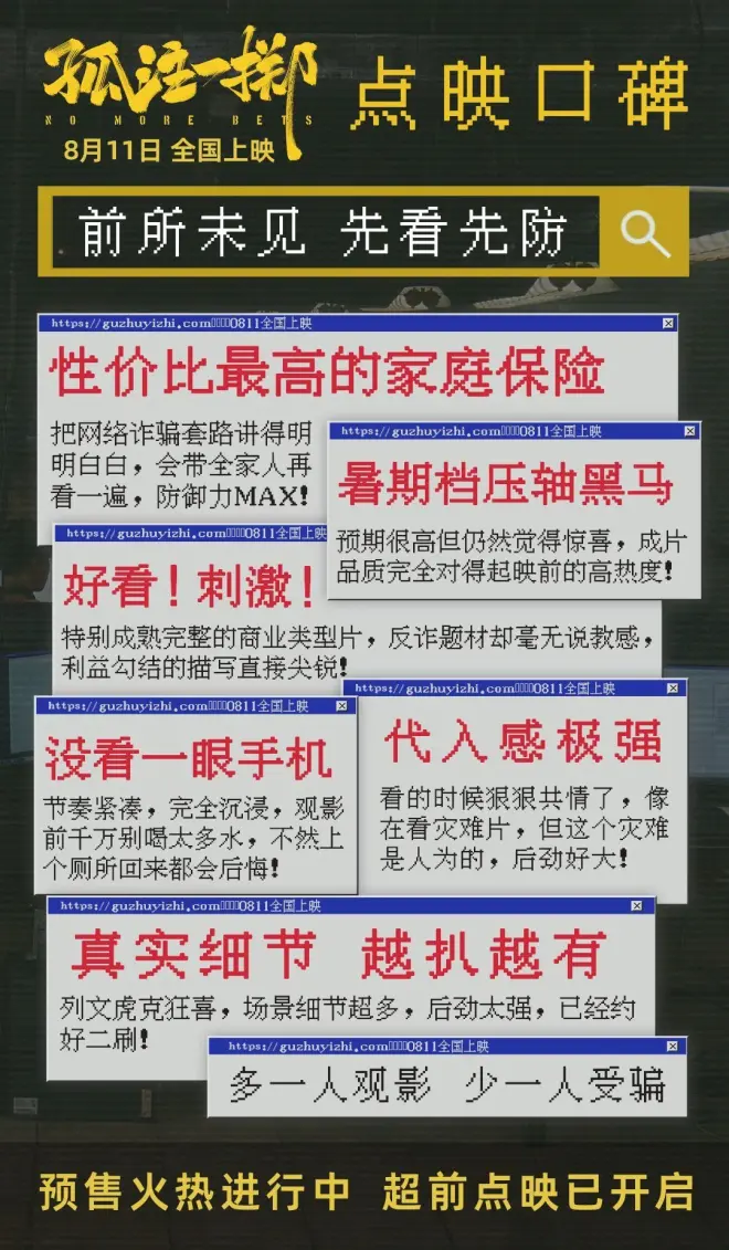 该片在提醒着大家遇到诱惑,遇到来路不明的消息,遇到陌生人的邀请,或许多一个心眼,悲剧就能避免。也正是影片对人性矛盾的这些展示,让《孤注一掷》,充满了后劲儿。就像官方所宣传的“多一人观影,就少一人受骗”。
