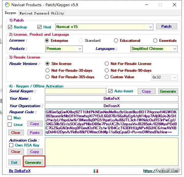 将Navicat手动激活窗口的请求码框中内容复制到注册机Request Code框中,点击Activation Code旁边的Generate按钮。