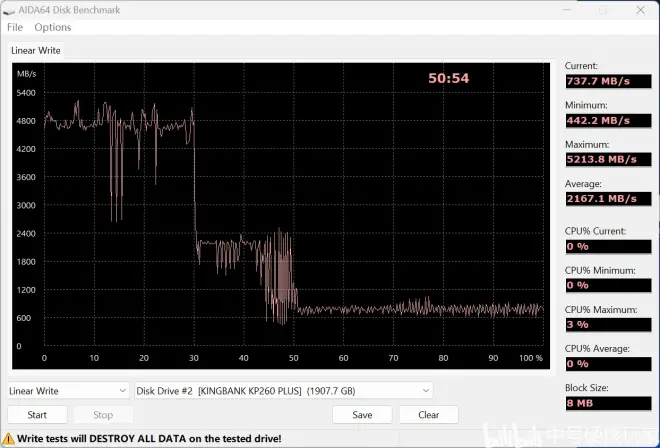 使用AIDA64进行SLC Cache全盘写入测试,空盘状态下,KP260 PLUS 2TB在SLC缓存阶段中,写入速度可维持4600 MB/s-5300 MB/s之间,中间有短时的瞬间波动,SLC Cache大小容量充足,大部分日常操作都用不完,中间TLC阶段维持在2000 MB/s上下,也有一些波动,最后一段曲线则是擦除回收+写入阶段,写入速度为700 MB/s左右,整体表现非常不错。
