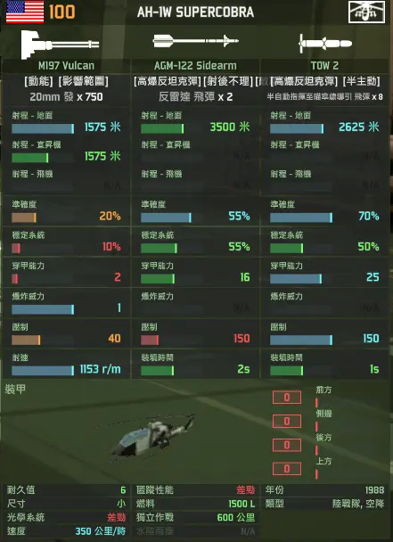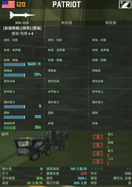 爱国者:美国地面空优,全游戏唯一能阻止固定翼对地攻击(除5250sead)的防空。但是完全没有反直升机的能力,需要m163或小懈树辅助。