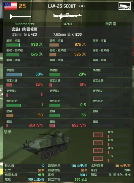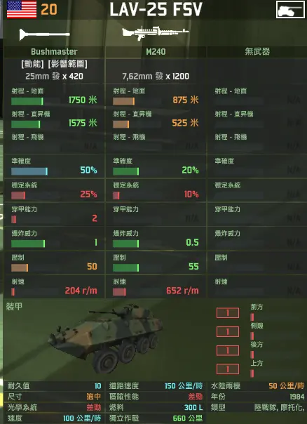 LAV:步兵不能坐的轮式步兵战车。这玩意要是能装备到步兵栏里,将是绝杀。可惜车辆栏里这个只有1甲的轮式机炮局限太大