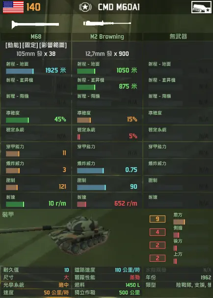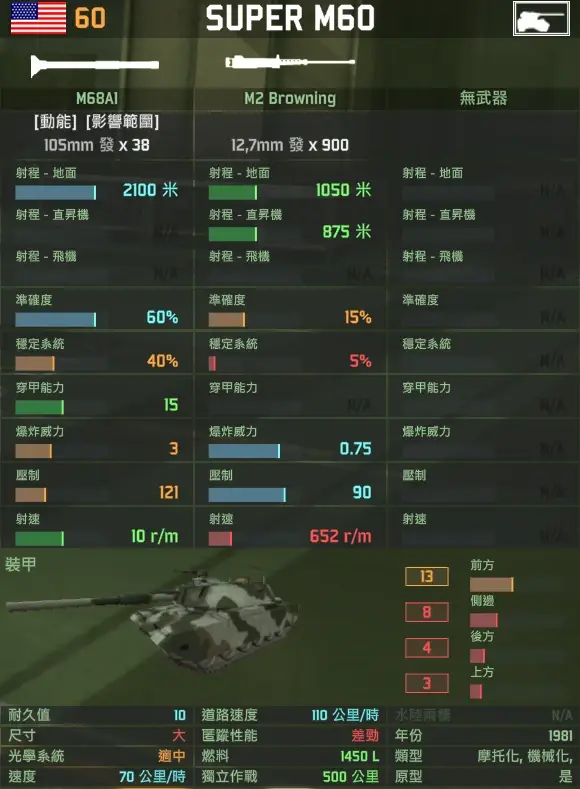 超级M60炮甲与M1一样,但是15穿使得它有在空地上作战的空间。虽然甲相对低一点,不能像m1一样使用,但是速度还是足够。林战面对冲步的追击生存能力很高