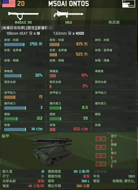 Ontos:装备了6连发heat无后坐力炮,虽然打步兵相当快,近距离对高富帅也有很大威胁,但是车体太烂,而且六连发打完就要进入长装填。并不好使