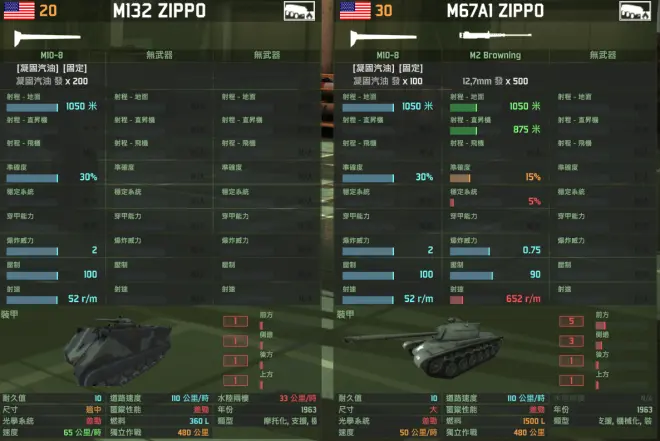 M163:它所搭载的火神炮是弹链(即一轮可以打完所有弹药),是很不错的防空。图中前者用来防空很不错,后者虽然不差,但是性价比不如前者(2450短了点)