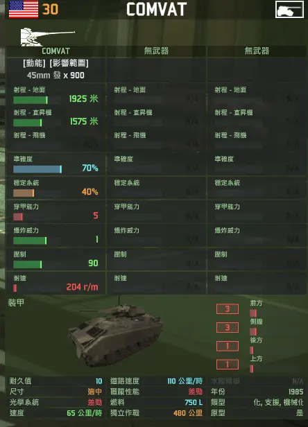 布莱德利侦(不讲武德车):比较难用。放在坦克战场侧翼可以吓吓人。如果要经济一点,也可以使用60分布莱德利,不过导弹穿深低一些