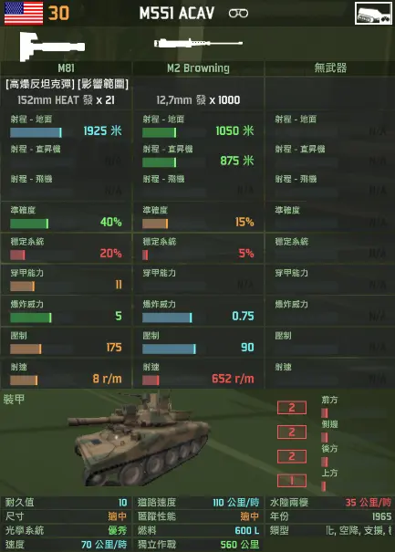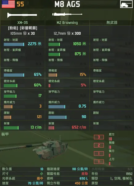 M8 AGS:先进反垃圾,甚至可以用于跟大坦克贴脸换炮。不过只有3甲,生存能力比较差。比较难用