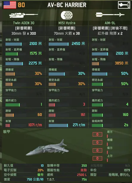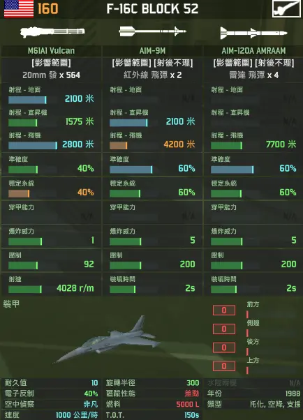 F16 block52:美国次顶级空优,导弹数据与F15C相差无几,可惜只有硬汉练度。如果美国追求4卡对地机,那么这个是首选(要有爱国者)