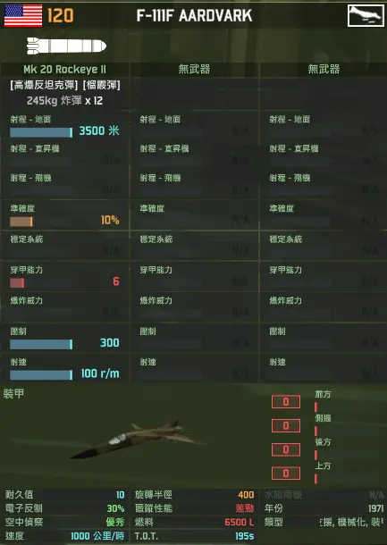 F-111F:美国粉机,要2架一起上。一般来说,粉机在大多数情况下不好用,基本用于强换对方高富帅/CV。所有不推荐萌新使用