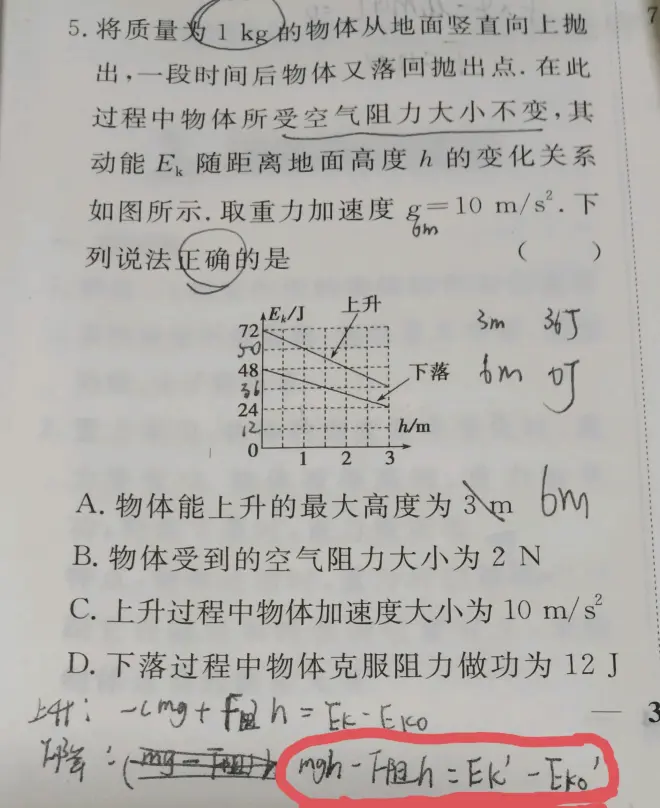 1:就是为啥摩擦力做功列式的时候可以写+Wf(图二),而阻力做功的时候要写mgh-F阻h(图一)。列动能定理啥时候加负号啥时候不加啊😭😭😭 2:就是图一这道题我用这种方法行不行:看上升那条线结尾落在36J那里,理解为3m, 剩36J,再升3m再少36J,所以最大高度为6m。 还是我这个是碰巧的(但是我做了两道题这种方法都对了),只能用动能定理。 大家能帮忙解答一下嘛😭😭😭😭,谢谢你们