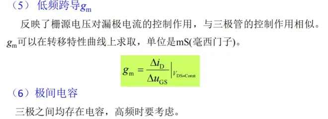 低频跨导:在管子工作在恒流区且u_GS为常量的条件下,i_D的微小变化量与引起它变化的Δu_GS之比。