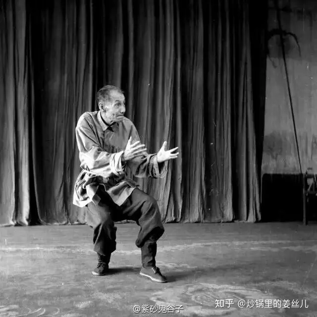 这个舞台展示的体型就可以以八项概括,简单易懂:含胸,拔背,抱肩,躬腰,吸臀,拢胯,曲腿,藏裆。完全是一派武人的那种“雄赳赳气昂昂”的姿态。这几点里甚至有的和传统戏曲武生表演是相悖的。比如:含胸,藏裆,躬腰等,武生在舞台上要八面威风,挺胸抬头,动作要大开大合才会好看;但实战则不然,一定要在某些时候护住要害,而且必须时刻全神贯注,这样就可能牺牲了很多美感。郑老牛就牛在:他把这两点整合了起来,使台上的表演既有实战的武术内核,又有艺术的观赏价值。以形意拳为首的多重武术对郑老身姿的锻炼让他在舞台上真有“抻筋拔骨”的力量灌注在身上,美不胜收!