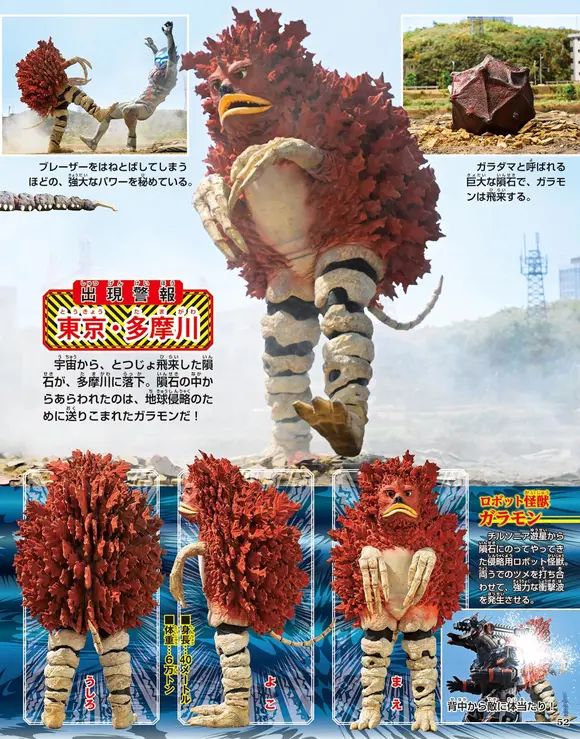 最后我们来看一下官方对嘎拉蒙进行定位是为陨石怪兽。事实上嘎拉蒙更接近机器人。而幼年迪玛伽是新作皮套,这应该是首次出现等比例身高的迪玛加,挺有意思的,不过从目前来看,布莱泽奥特曼似乎并不会以等比例的姿态进行变身。