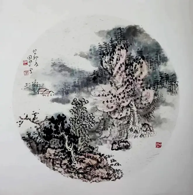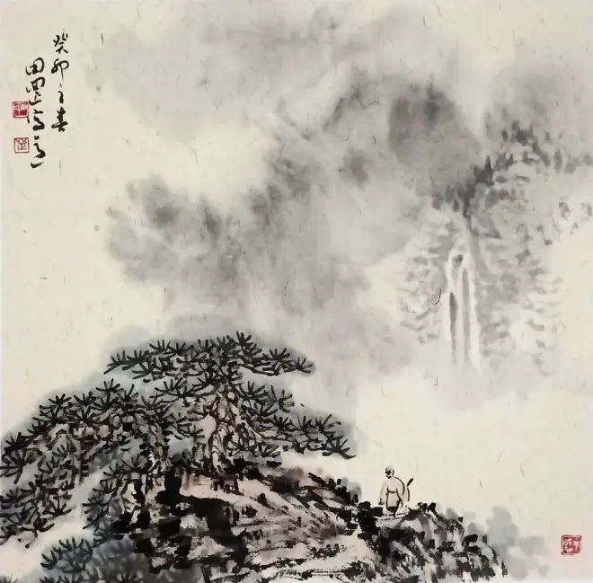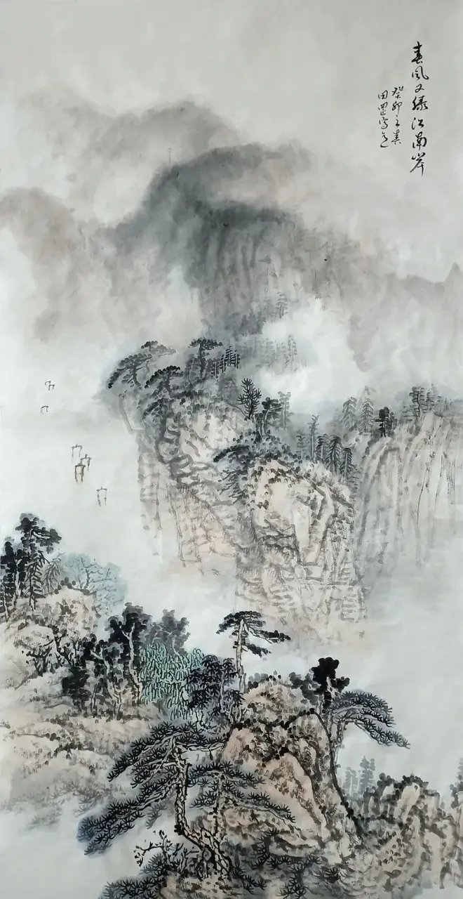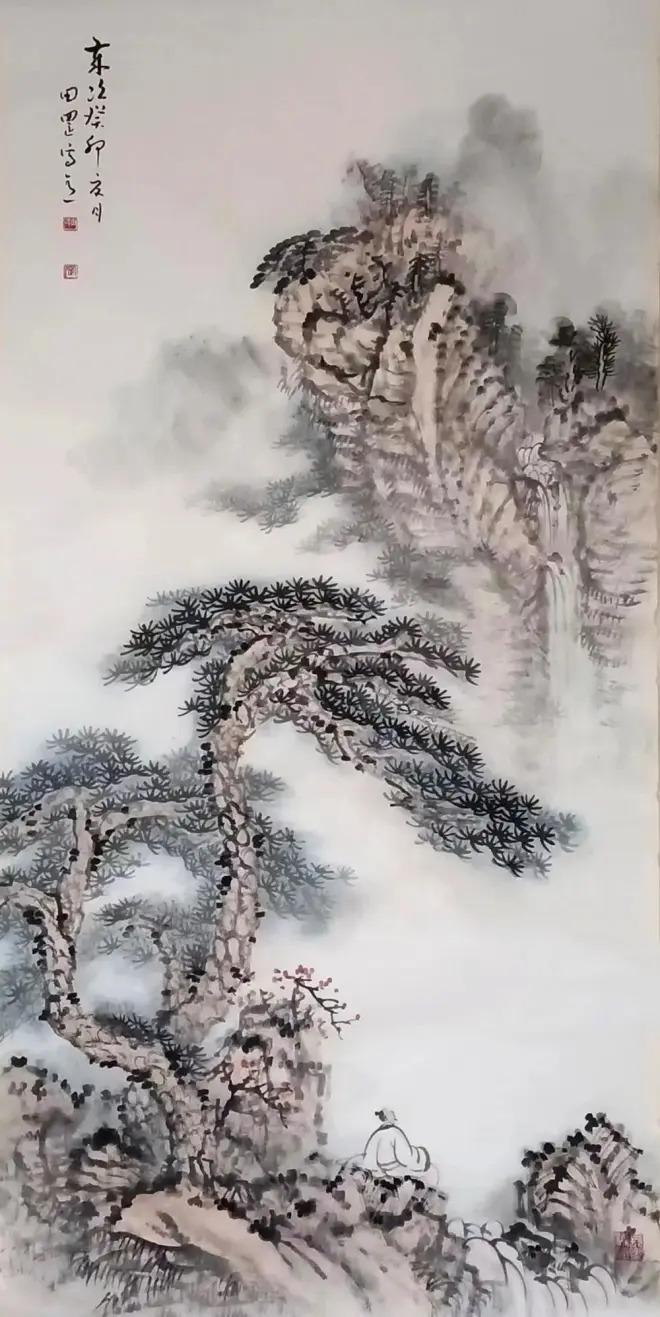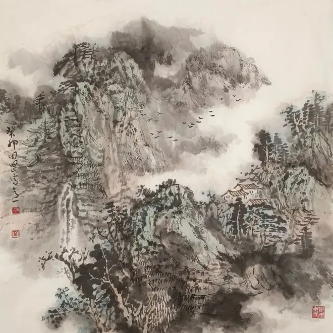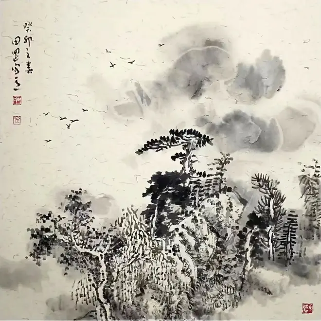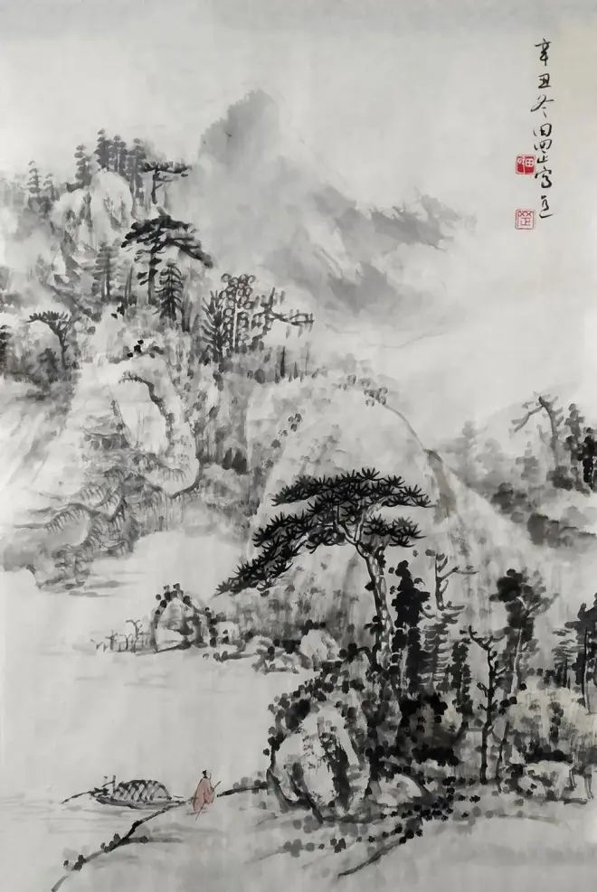 在恩师孙长康、曾昭国诸先生的悉心教导之下,醉心于宋元明清传统山水的临摹和研究,尤于元四家及清四僧用功最勤,故能使其所作山水作品,山石嶙峋皴擦点染浑厚天成。又能汲近代山水大家之长,于作品远景中散锋泼墨与近景骨法用笔勾皴的山石形成墨块与墨线的辉映。虚实相生,阴阳向背,絪蕴浑成,而幽深之境自生。可谓神用象通情变所孕,物以貌求心以理应。在刻意营造精神归宿的同时,笔墨淋漓,随心所欲而不逾矩,又不为法障,从而使其山水生发出全新的审美命题。升华为意境开阔,格调高雅,深根于传统笔墨又具当代笔墨精神的清新静远的时代山水。人们从其作品呈现的诗意境界和空灵意蕴中可以领略其笔墨的追求和精神的坚守。