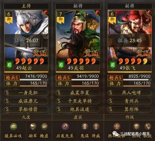 总结:可以看到,这套阵容很多时候打其他满红的战损都是2000-4000,发挥好点甚至在一千左右,在多穿强度方面也是没有太大的问题,队伍主将位置不固定,可以是赵云或者关羽,如果满红张飞有熊烈的话,也可以带输出战法,让关二爷打辅助。比起早期传统的五虎枪来说,这套阵容多了青州兵和草船借箭的回血和解控,加上千里走单骑的出现让关羽有了更多的出手几率,降低了演戏的可能,威谋糜亢打中后期队伍也具备压制力和一定的上限。