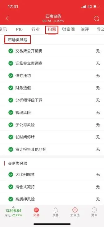 答:任意选择一只个股,在个股行情页面中,依次点击下方“扫雷”——“市场类风险”,就可查看该股的市场类风险。(如下图)