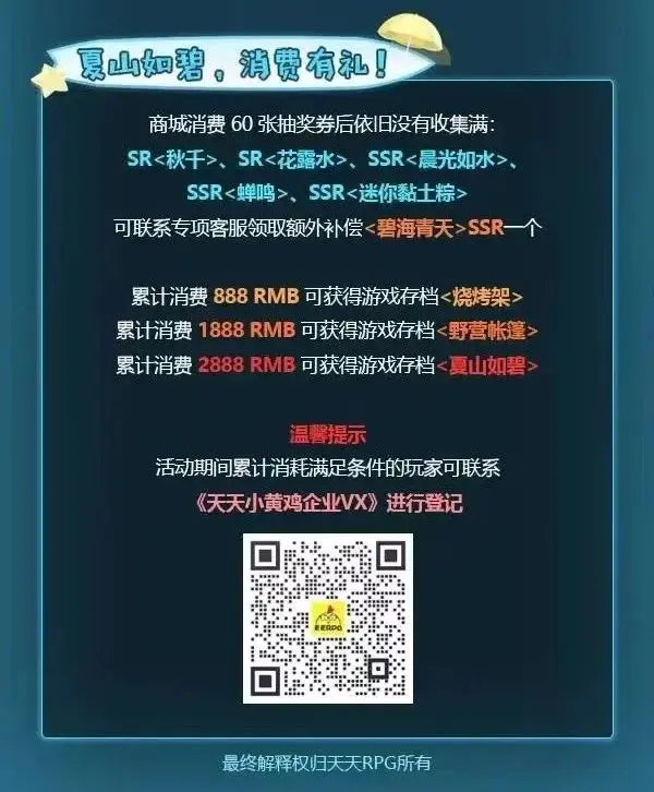活动期间,玩家在全新宝箱中使用达到60张抽奖券依旧没有集齐所要求的道具之时将可获得额外补偿的SSR道具一个,另外,每消费达到一定金额便可解锁出一个额外的存档奖励,具体可看下图。