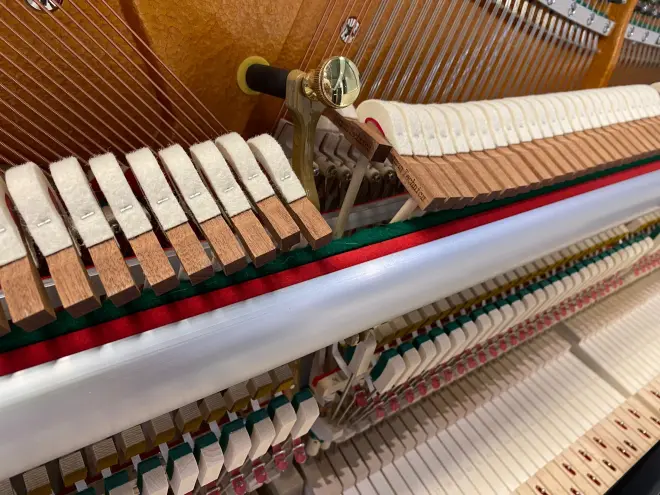钢琴因为结构的特殊性和其他的弦乐乐器还不一样,像吉他这些小的乐器,调音也是比较简单的,基本每次在使用的时候都会调一下音准,使用者自己就可以操作了,包括小提琴这些乐器都是自己就可以调整音准,然而钢琴就不一样了 ,一台钢琴有88个琴键,总共有200多根琴弦,低音区又2根或一根琴弦构成一个琴键音,中高音区都是三根琴弦为一个音。