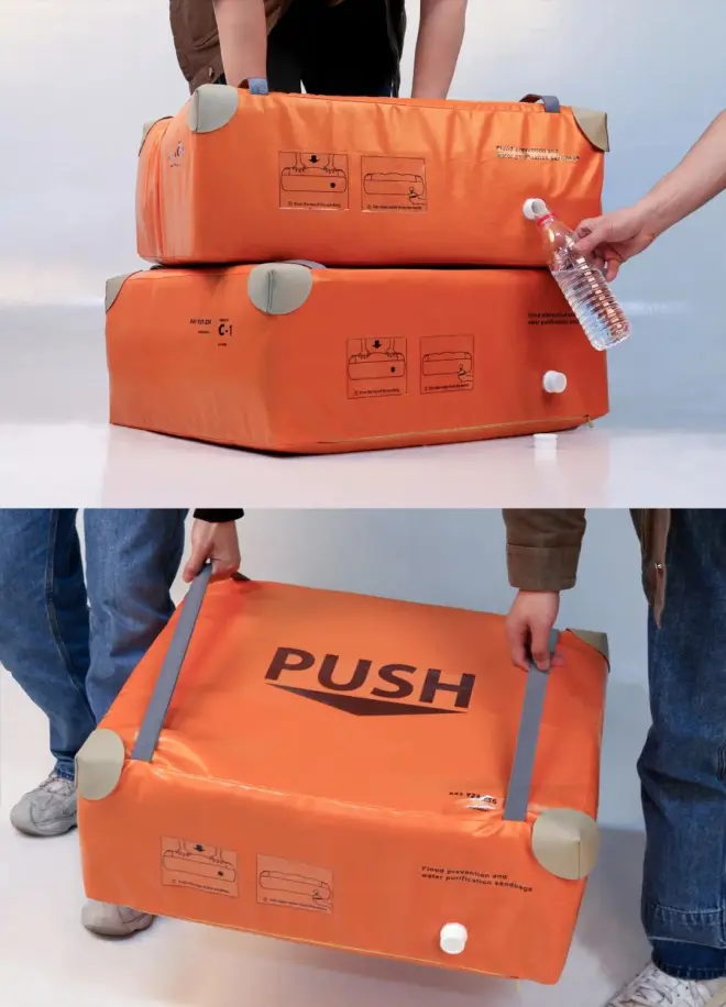 防洪净水沙袋解决了传统防洪沙袋使用繁琐和净水问题,采用高密度压缩海绵吸水,便于运输。内置净水装置过滤污水,提供干净饮用水。材料可持续且制作成本低。提高受灾地区防洪能力,减少经济损失,保障灾后饮水卫生。