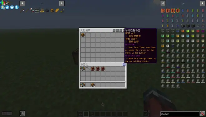 alt+单击这个向上的箭头可以实现只存入和箱子里物品一样的物品,例如现在我的物品栏里有箱子和其他物品,打开的箱子里有箱子,按下这个组合键后,只会将箱子存入,其他物品则不动。