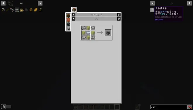 若要查找某一物品如何获得或怎么用,请善用右下角的搜索框,本整合包加了jecmod,因此可以直接用拼音或首字母搜索