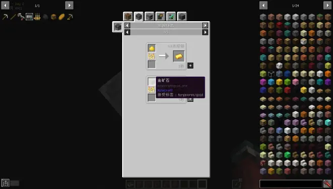 例如这里,指向金矿石时,它会显示[接受标签:forge:ores/gold],而注册了该标签的有金矿石与下界金矿石,它们都可以丢进高炉冶炼成金锭,所以,在将来看到下面的配方时,你也不再需要发愁材料从何而来了。
