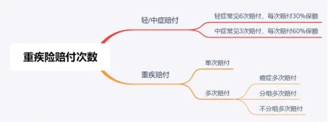从前的重疾险产品,大多数都是只赔1次重大疾病的,各家保险公司为了竞争,不仅引入了轻中症的赔付,还增加了重疾的赔付次数,分类见下图: