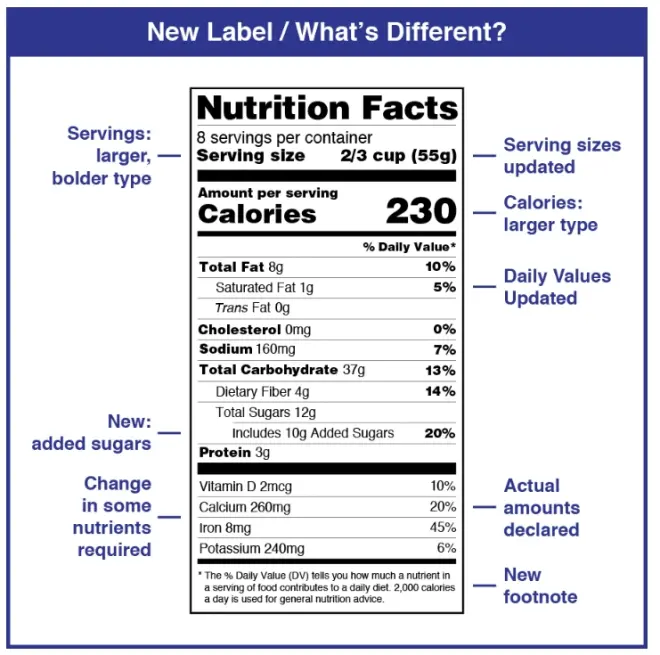 FDA在2016年5月27日发布了有关包装食品新营养成分标签的最终规定,以反映新的科学信息,包括饮食与肥胖和心脏病等慢性疾病之间的联系。新标签使消费者更容易做出更明智的食品选择。新标签已经出现在包装上。年销售额超过1000万美元的制造商必须在2020年1月1日之前改用新标签;年食品销售额不足1000万美元的制造商必须在2021年1月1日之前达到要求。FDA计划与制造商合作,以满足新的营养成分标签要求。大多数单一成分糖(例如蜂蜜和枫糖浆)和某些酸果蔓产品的制造商必须在2021年7月1日之前做出更改。