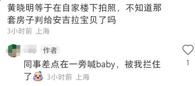 据悉,黄晓明在上海有一套豪宅,有网友调侃,他这是在自家楼下拍戏吧,不知道离婚后,房子有没有判给baby呢?搞笑的是,对方的同事把张嘉倪认成了baby,差点还叫了出来。