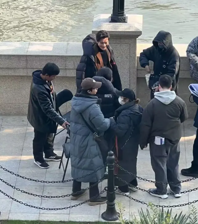 照片中,黄晓明和张小斐都穿了一件长款棉服,助理帮两人拿来凳子,张小斐估计是在看剧本,黄晓明则站在旁边。能够看到,上海的天气还是非常冷,大家包裹得非常严实,一群人围在一起,场面十分热闹。