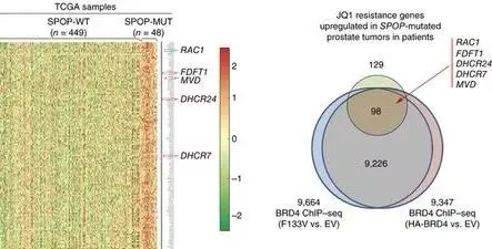图2. (左)基因热图,相比于野生型SPOP,在突变型SPOP的肿瘤细胞中,FDFT1, DHCR24,DHCR7和RAC1等被上调。(右)维恩图解(图片来源《Nature》)
