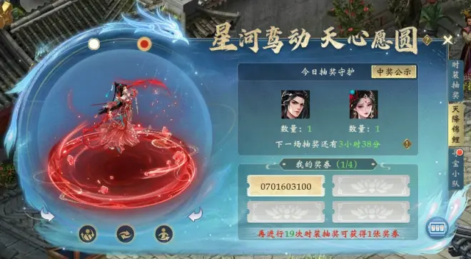 ② 每日20:10开启抽奖,每轮抽奖随机抽取1张奖券,中奖玩家可获得周年守护,守护将发放至时装抽奖的奖励仓库中,每5分钟进行1轮抽奖;