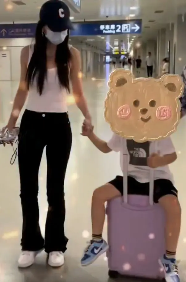 Baby穿着简单的吊带长裤搭配棒球帽,身材纤细火辣,丝毫不像孩子妈。而小海绵在妈妈面前十分开朗活泼,自己坐在行李箱上玩得很开心,时不时还要跟妈妈撒娇要牵手。