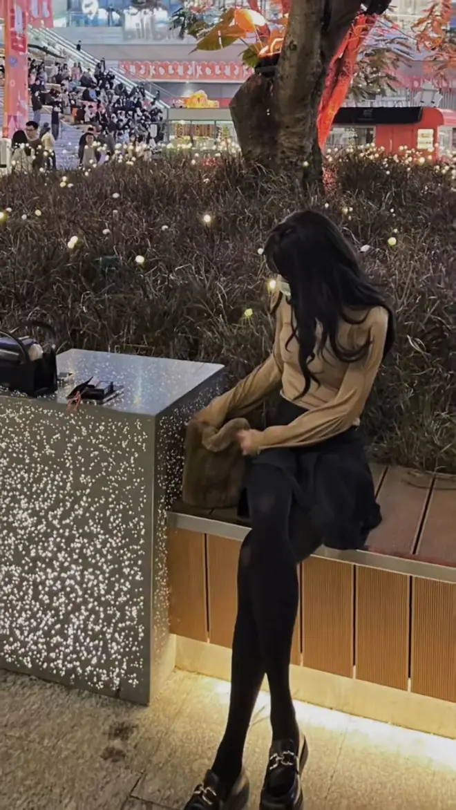 肉色V领紧身上衣搭配黑色百褶短裙+黑丝+黑色小皮鞋