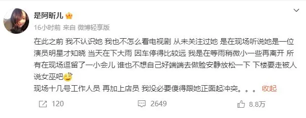 对方表示,自己并不认识王楚然,也没看过她演的电视剧,当天在现场才知道有一位明星在拍广告,由于那时候下雨,所以在附近逗留了一会,原本想安安静静做个脸,没想到却被对方说像女巫。