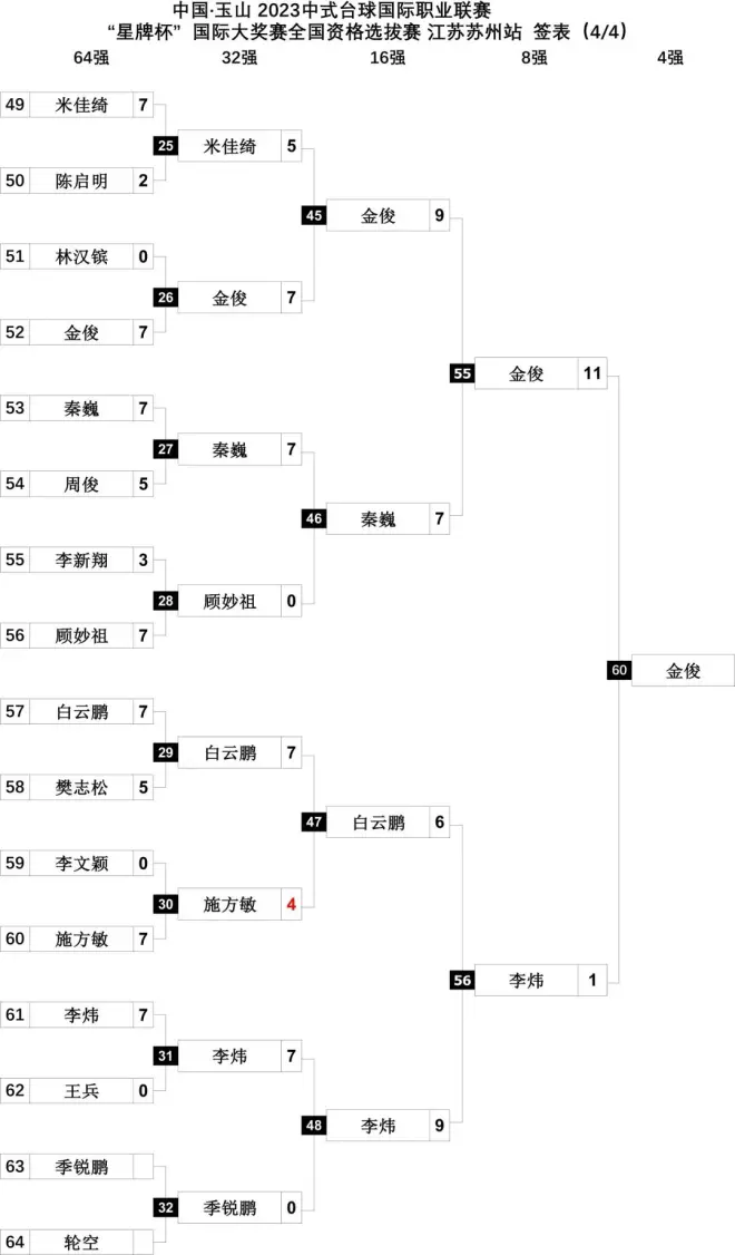 另外两张门票归属分别由来自山东的刘鑫和吉林的金俊获得,在出线轮他们分别战胜董斌和李炜晋级。