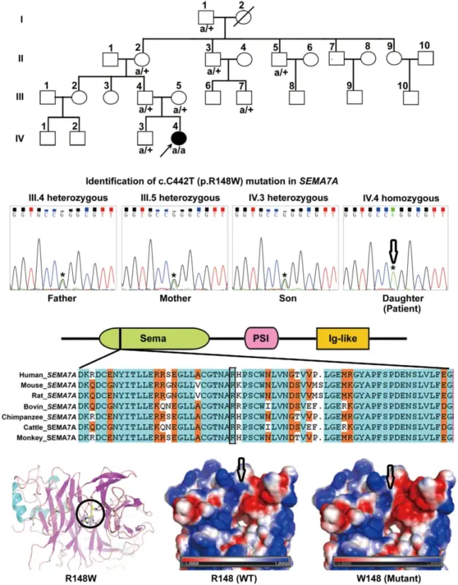 图1 一个罕见的SEMA7A纯合子R148W突变新病例