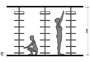 为了方便读者立姿取放图书,书架高度H不大于“立姿双手功能上举高”;为了方便读者蹲姿搜寻图书,书架高度H应小于“蹲姿目视最低高度”。