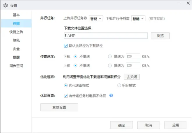 根据需要修改下载路径即可;将下方的”优化速率模式“选项勾选上即可大幅度提高百度网盘的下载速度(亲测能和steam下载速度相匹配,40m/s左右;不过在下小文件时速度会下滑一些)