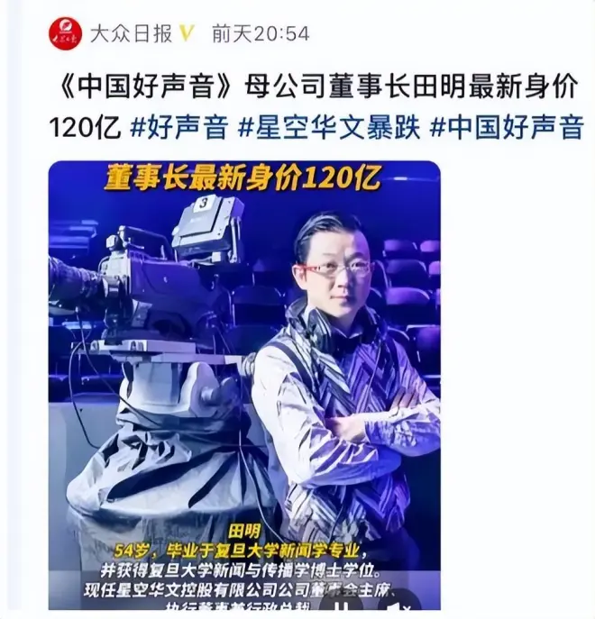 媒体公开报道资料显示:《中国好声音》母公司董事长田明最新的身价是120亿。