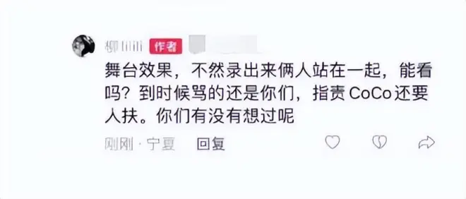 对于过去造成李玟摔倒的原因,柳骊说:这是舞台效果,不然露出来俩人站在一起,能看吗?到时候骂的还是你们,指责COCO还要人扶。你们有没有想过呢?