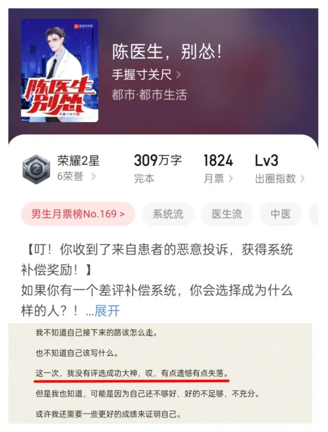 今天看到手握寸关尺发了《陈医生,别怂!》的完结感言,其中有提到,这次未能评选成功大神,有点遗憾。