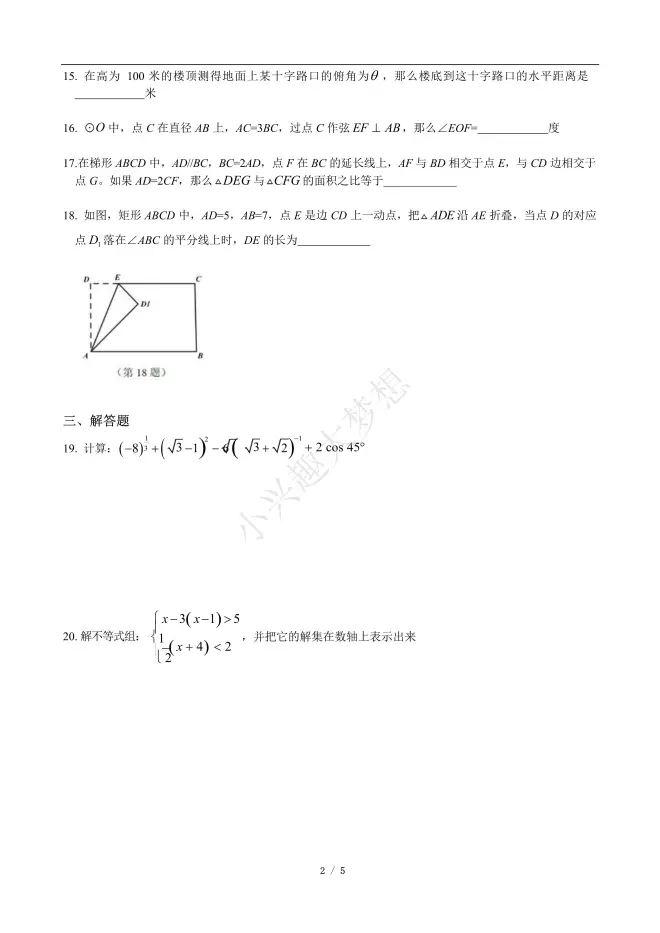 2022年上海市普陀区初三期中数学考试(答案参考)