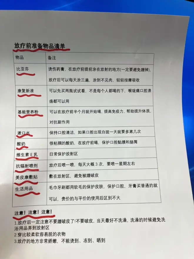 我一大早就向病友们咨询了关于去做放疗的注意事项以及需要准备哪些东西来减少病人的痛苦和副作用。我一定要做好准备,不要像媳妇刚开始化疗时那样一无所知,白白受苦。