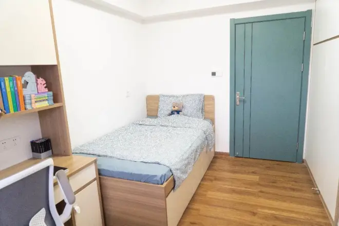 宿舍单间不仅仅是就寝的空间,仔细观察,你会发现它还是一个全能的储物区,床的侧边有三个抽拉式的柜门,能储藏那些零零碎碎的杂物,使你的卧室看起来清爽整洁,焕然一新;紧邻大床是橱架桌屉一体式学习桌及人体工程学座椅,充分助力你在宿舍空间内的学习。