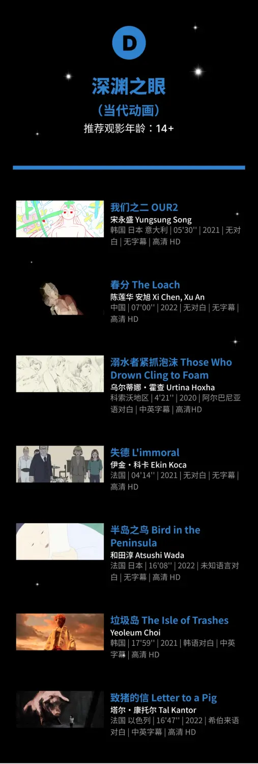 2. AB单元(全家场)适合全年龄观看,推荐观影年龄:4+;CDEF单元(当代动画)适合成年人观看,推荐观影年龄:14+。