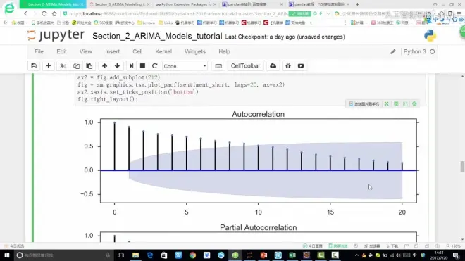对于AR模型,求p值看PACF图像。由图可知在2阶后进入置信区间(即截尾),所以该模型p值取2: