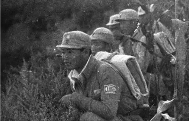 等日伪军队伍进入伏击圈,乔装打扮成农民的十几个战士挑着柴来到大路上,用柴捆挡住了汽车的去路。