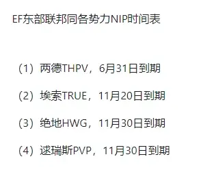 3月24日,EF联盟发布的一则公告更是加快了新伊甸掀起新一轮会战的速度。在公告中,EF特别强调了自己与各方势力之间NIP协议到期的时间,同时将PVP与YH的声望调整为红。