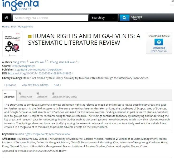 澳旅院毕业生、澳大利亚墨尔本大学法学院博士生唐智棋于澳旅院吴志伟讲师及庄允诺导师带领下,完成检视127篇关于奥运及世界杯足球赛等大型活动的研究记录,并找出这些活动与人权状况的关系。除此之外,该论文更成功登上澳大利亚商学院院长理事会期刊品质列表(Australian Business Deans Council——ABDC)A级期刊《活动管理》(Event Management),足证澳旅院不断进步的教研水平。