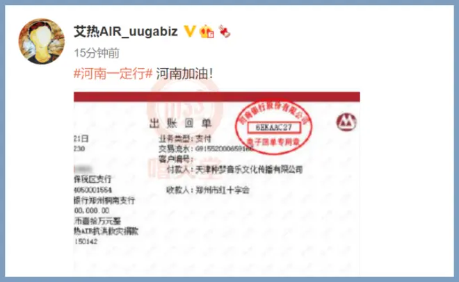 辛巴向河南灾区捐出演出收入1.2万元。